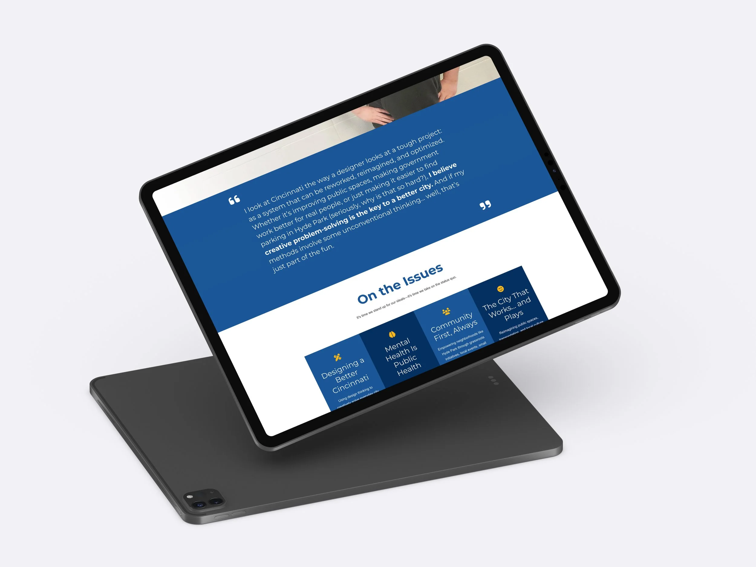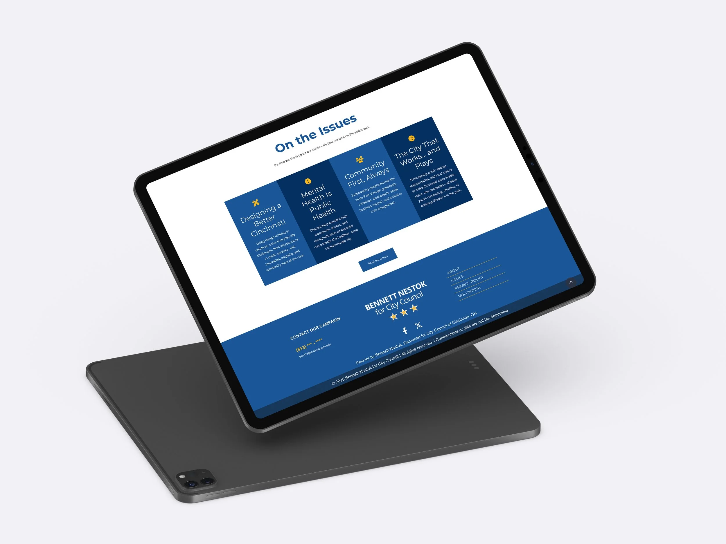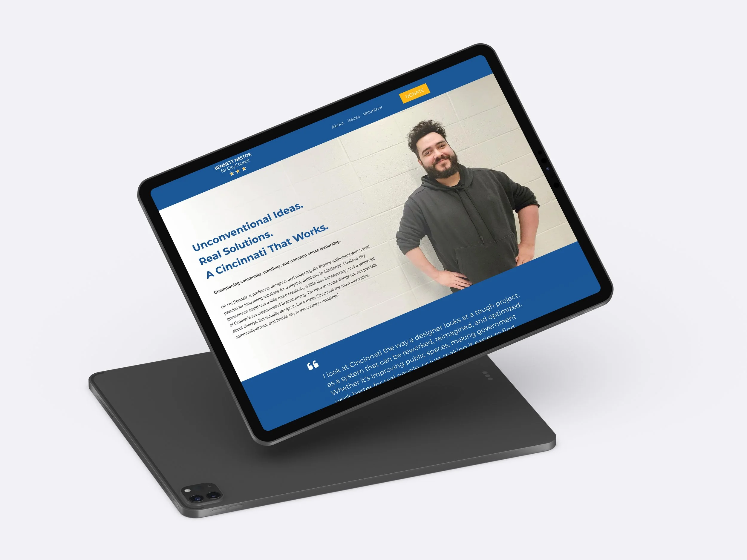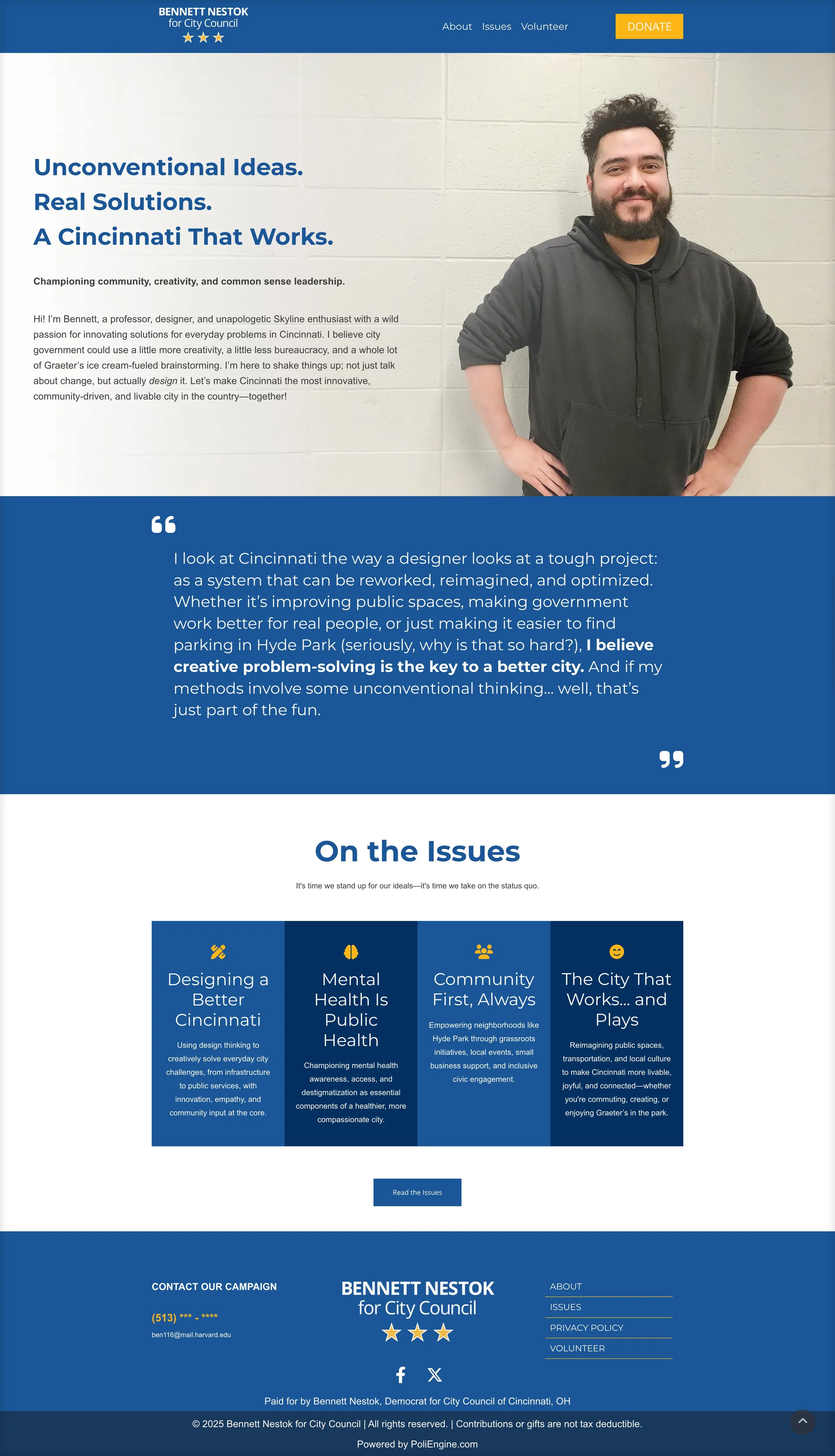 Campaign Site (V1) First pass at a campaign webpage! Can’t wait for V2. First pass! (Needs some aesthetics finesse…) View fullsize Splash image View fullsize Main quote View fullsize The issues